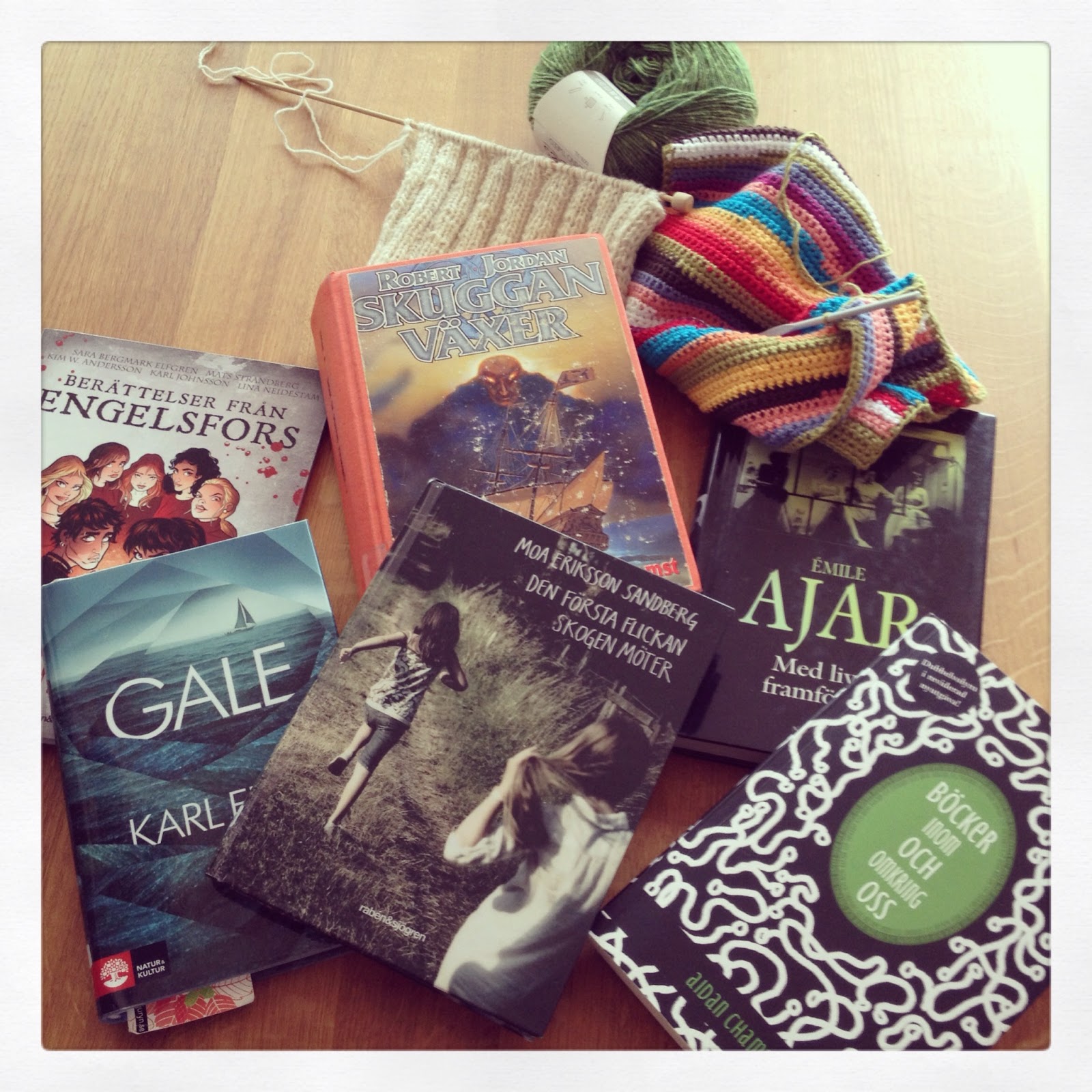 Jag har en bokcirkel tillsammans med ett gäng som jag pluggade med i Lund. Vi har hängt ihop i åtta år nu och träffas ungefär en gång i månaden. Med ojämna mellanrum ger vi oss av på övernattningsbokcirkel i en sommarstuga i Göingeskogarna och pratar om böcker, livet, virkning/stickning och mat. På ett ungefär. Och så läser, lever, virkar/stickar och äter vi en massa. I helgen var det dags igen. Mycket mycket fint! Och när vi la upp vårt tidsfördriv på bordet visade det sig vara en salig blandning. Det finns ingen mall för vad bibliotekarier ska läsa, helt enkelt. Härligt!
