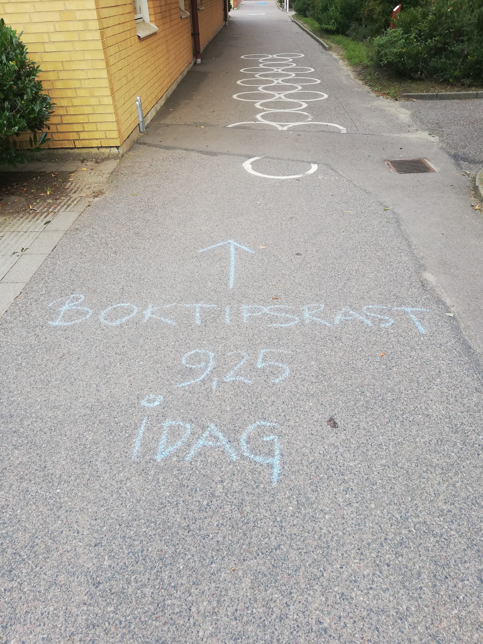 Ritad pil på skolgården som visar mot biblioteket och Boktipsrasten