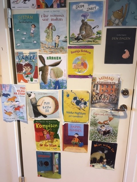 Personalen började sätta upp bokframsidor tidigt i våras och det räcker inte längre med en vägg för alla bilder, utan nu finns det bokframsidor på två väggar. Så fint!