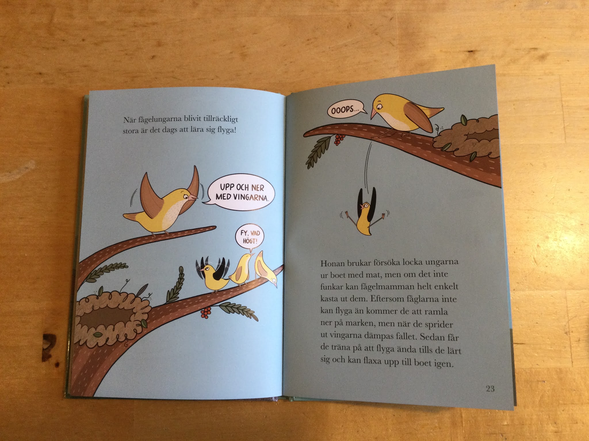 Siduppslag ur boken där en fågelmamma puttar ner sin unge från grenen och utbrister ”Ooops”