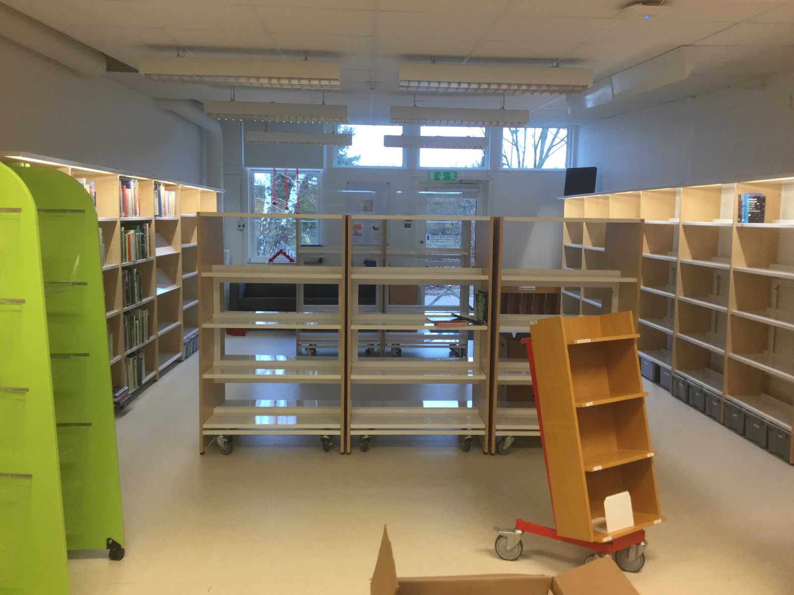 Rinnebäcksskolans bibliotek flyttade till nya lokaler under höstlovet. Nu har de nya möblerna kommit och arbetet med att packa upp alla böckerna är i full gång!