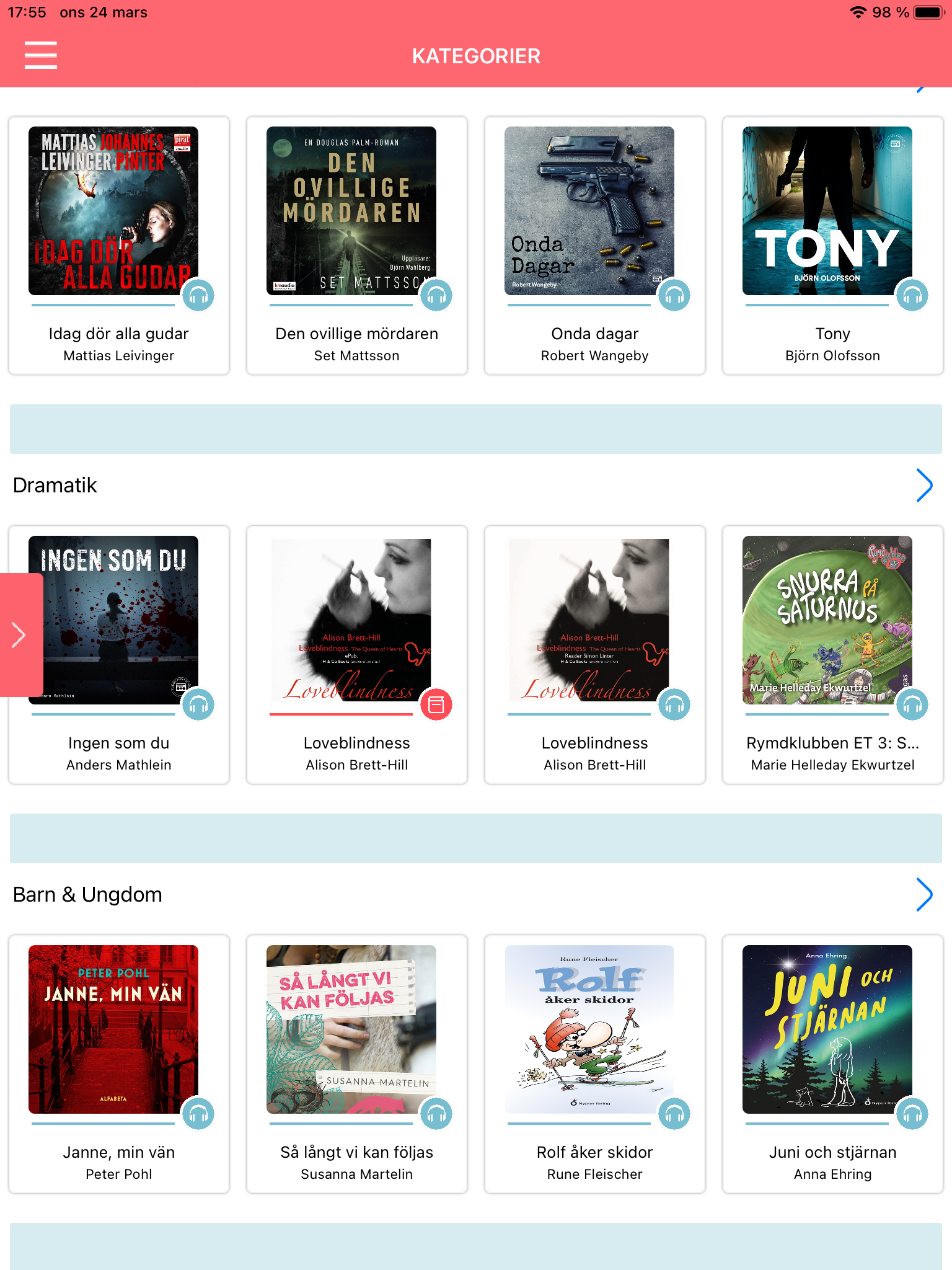 Jag läser gärna digitalt också, helst på min läsplatta, med matt skärm och e-ink, men som synes även på min Ipad där jag läser böcker från Bibblix. Den stora fördelen här är att jag får plats med måååånga böcker utan att det väger mer än Ipaden eller läsplattan och att jag när jag läst ut en del i en bokserie kan ladda ner nästa del, utan att ta hänsyn till bibliotekets öppettider 🙂