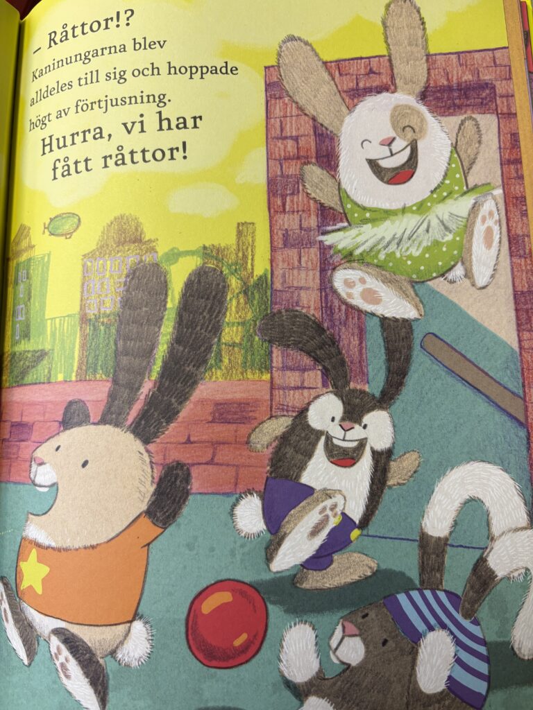 I De nya där nere möter vi en massa djur som bor i ett höghus. En dag kommer Herr Duva med bud om att några råttor flyttat in på bottenvåningen! Kaninungarna blir eld och lågor! Så roligt med nya grannar!! De vill genast hälsa på dem.