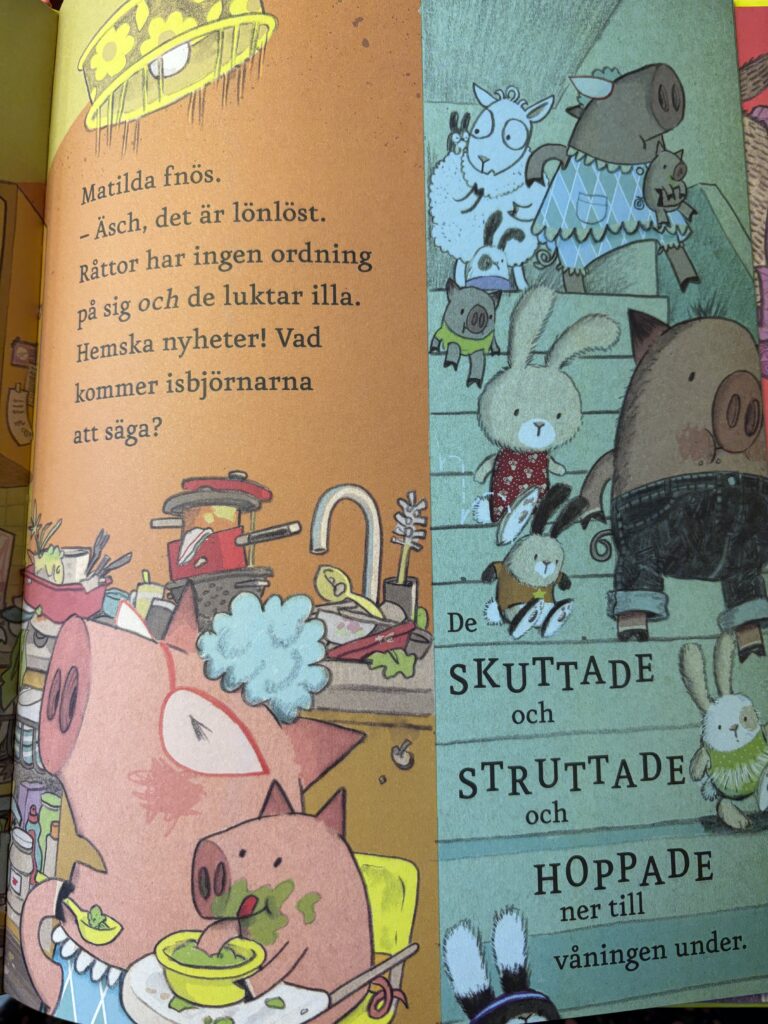 Jag har precis jobbat med boken i fyra ettor. Jag läser högt och vi pratar om ryktesspridning vilket boken är perfekt för. Vi kom in på lögner, sanning, fakta och att man ska ställa frågor om man hör något om någon annan. Vi kom också in på varför det kan vara så att rykten sprids. Kanske är man rädd sa en elev en annan sa högt och argt ”man ska inte kasta sten i glashus!” (Detta på grund av att grisarna hade det lite väl stökigt och beskyllde råttorna för att vara smutsiga och lukta illa.)