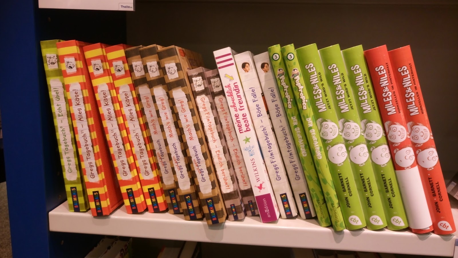 När jag är på semester kollar jag alltid in i bokaffärer. Gärna bibliotek också om familjen samtycker… Jag gillar framför allt att spana in barn och ungdomsböckerna, och upptäckte snabbt att det som är populärt på Rinnebäck även är populärt i Tyskland tex Kinneys böcker om Greg och Nikkis dagbok. Guinness rekordbok är också en favorit! Det finns många andra spännande böcker som jag inte känner igen, och jag ska kolla upp några och se om de finns på svenska.